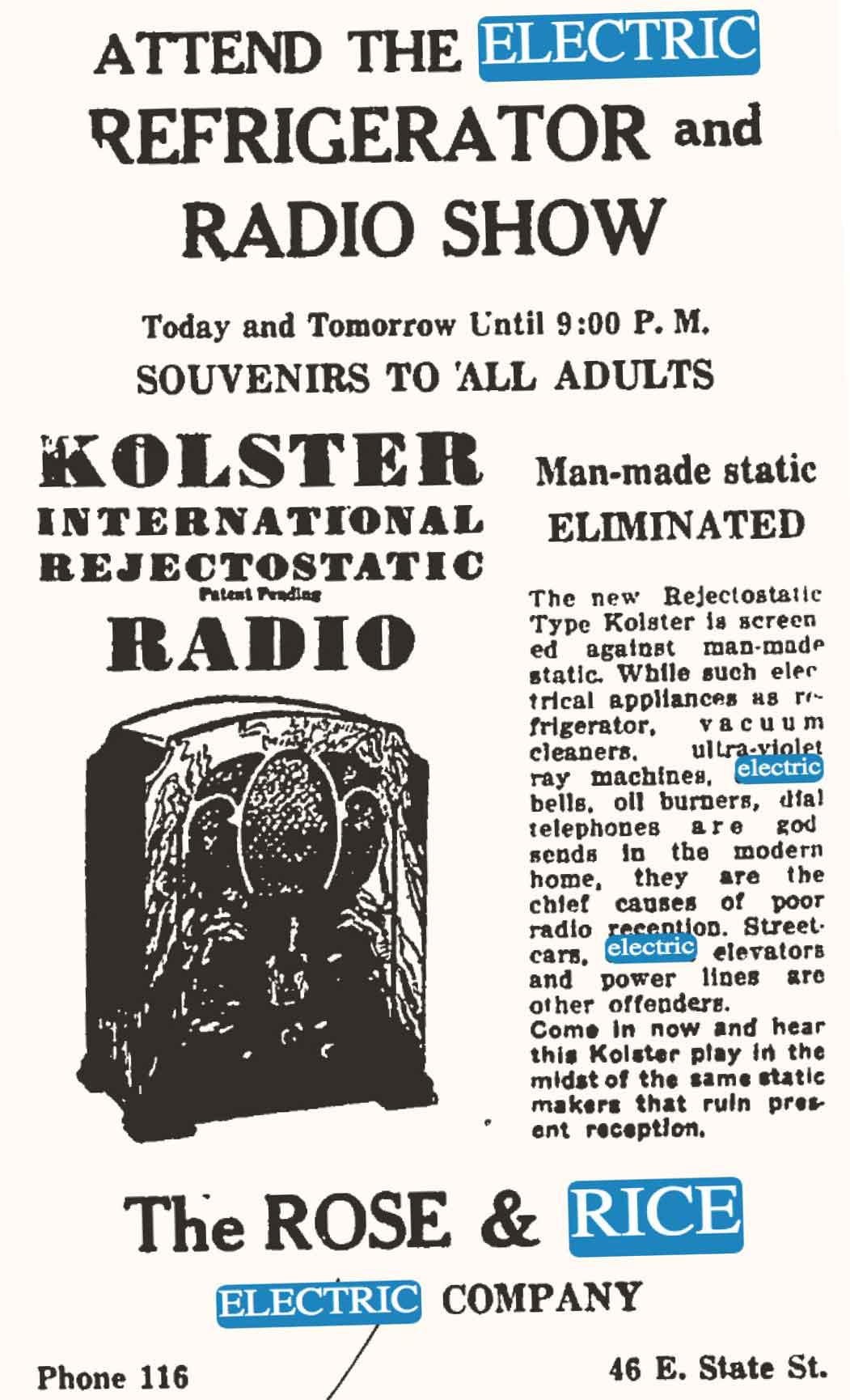 featuring a modern refrigerator for Rice Electric, 1931.